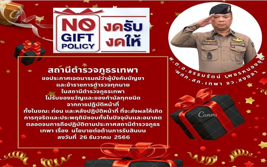 ผู้บังคับบัญชาและข้าราชการตำรวจทุกนาย ในสถานีตำรวจ ไม่รับของขวัญและของกำนัลทุกชนิดจากการปฏิบัติหน้าที่ ทั้งในขณะ ก่อน และหลังปฏิบัติหน้าที่ ที่จะส่งผลให้เกิดการทุจริตและประพฤติมิชอบทั้งในปัจจุบันและอนาคต ตลอดจนการถือปฏิบัติตามประกาศคณะกรรมการป้องกันและปราบปรามการทุจริตแห่งชาติ เรื่อง หลักเกณฑ์การรับทรัพย์สินหรือประโยชน์อื่นใดโดยธรรมจรรยาของเจ้าพนักงานของรัฐ พ.ศ. 2563