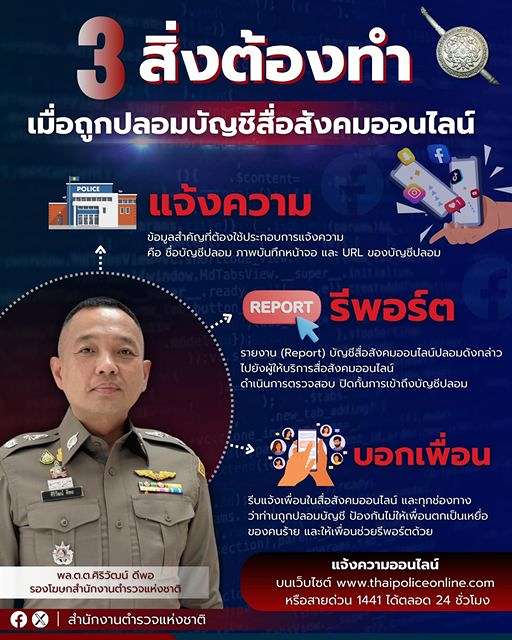 3 สิ่งที่ต้องทำ เมื่อถูกปลอมบัญชีสื่อสังคมออนไลน์ “แจ้งความ รีพอร์ต บอกเพื่อน” . พล.ต.ต.ศิริวัฒน์ ด