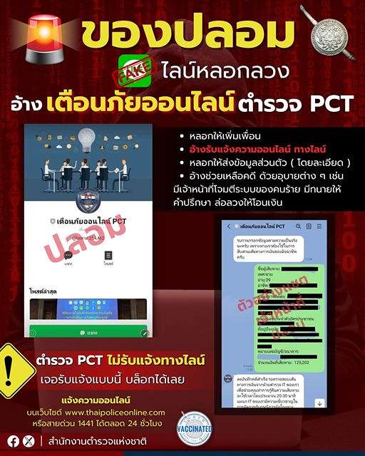 อ้าง ตำรวจ PCT รับแจ้งความทางไลน์ ( LINE ) มิจฉาชีพทำขึ้นมาหลอกลวง อ้างเตือนภัยออนไลน์ ตำรวจ PCT หลอ