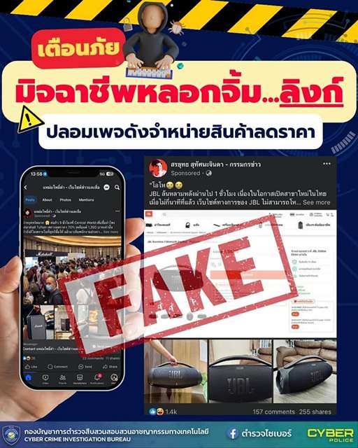 ตำรวจไซเบอร์เตือนภัย มิจฉาชีพหลอกจิ้มลิงก์ ปลอมเพจดังจำหน่ายสินค้าลดราคา . ตำรวจเตือนภัย ช่วงนี้พบมิ
