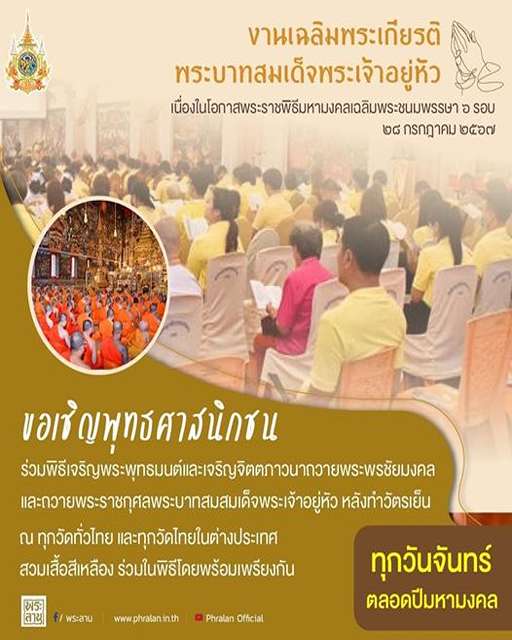 ขอเชิญพุทธศาสนิกชนร่วมพิธีเจริญพระพุทธมนต์และเจริญจิตตภาวนาถวายพระพรชัยมงคล และถวายพระราชกุศลพระบาทส