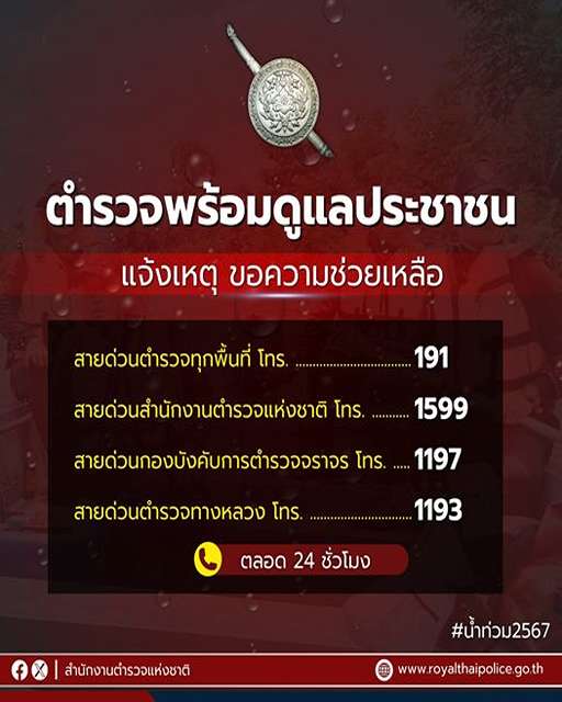 สำนักงานตำรวจแห่งชาติ ห่วงใยพี่น้องประชาชนในพื้นที่ประสบอุทกภัย โดยเปิดสายด่วนให้ความช่วยเหลือประชาช