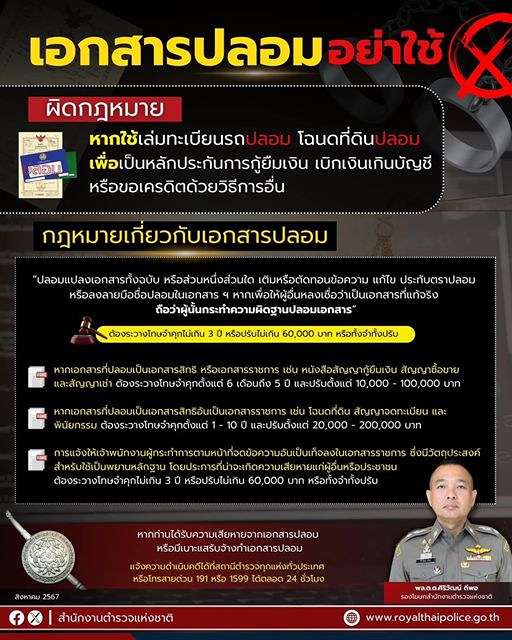 สำนักงานตำรวจแห่งชาติเตือนการใช้เล่มทะเบียนรถปลอม หรือโฉนดที่ดินปลอม มาใช้เป็นหลักประกันการให้กู้ยืม