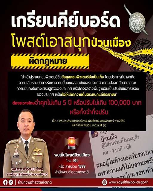 ” สำนักงานตำรวจแห่งชาติ “ เตือน โพสต์เอาสนุก หวังป่วนเมือง โทษหนัก จำคุก 5 ปี ปรับ 100,000 บาท . พล.