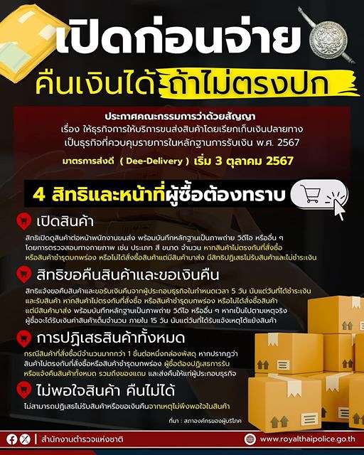 เริ่มแล้ว ช้อปออนไลน์ เปิดก่อนจ่าย คืนเงินได้ ถ้าไม่ตรงปก . มาตรการส่งดี มีผลบังคับใช้ตั้งแต่ 3 ตุลา