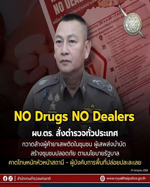 ผบ.ตร. สั่งตำรวจทุกพื้นที่ทั่วประเทศกวาดล้างผู้ค้ายาเสพติดในชุมชน ผู้เสพส่งบำบัด สร้างชุมชนปลอดภัย ต
