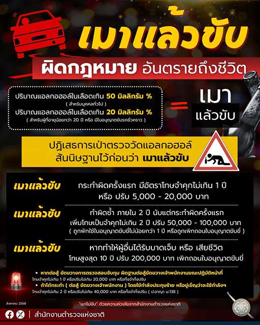 รู้หรือไม่ หากปฏิเสธการเป่าตรวจวัดแอลกอฮอล์ กฎหมายให้สันนิษฐานไว้ก่อนว่า “ เมาแล้วขับ ” ” เมาขับ “ อ