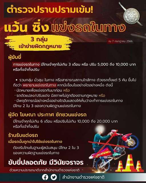 บทบัญญัติของกฎหมายที่มีการกำหนดบทลงโทษไว้อย่างชัดเจน ได้แก่ • การแข่งรถในทาง มีโทษจำคุกไม่เกิน 3 เดื
