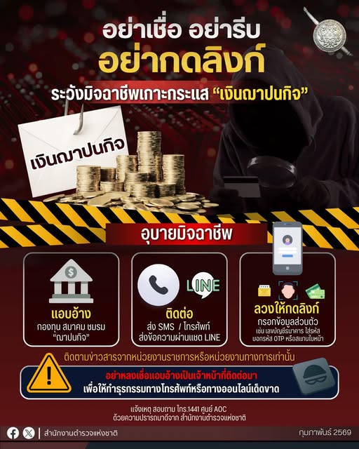 อย่าเชื่อ อย่ารีบ อย่ากดลิงก์ ระวังมิจฉาชีพ เกาะกระแส “ เงินฌาปนกิจ ” . อุบายมิจฉาชีพ แอบอ้างมาจากกอ