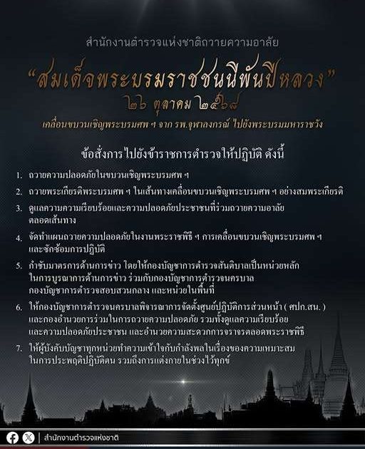 รองโฆษกสำนักงานตำรวจแห่งชาติ กล่าวว่า ผบ.ตร.กำชับตำรวจทุกนายที่ร่วมภารกิจสำคัญครั้งนี้ ให้ดูแลความเรียบร้อย และดูแลความปลอดภัยให้พี่น้องประชาชนที่จะหลั่งไหลร่วมถวายความอาลัยตลอดเส้นทางขบวนเชิญพระบรมศพฯ เป็นระยะทาง 10 กิโลเมตร ตลอดจนให้อำนวยความสะดวกการจราจรในเส้นทางต่าง ๆ ที่เกี่ยวข้อง โดยมอบหมายให้ พล.ต.อ.สำราญ นวลมา รอง ผบ.ตร. เป็นผู้รับผิดชอบกำกับดูแล