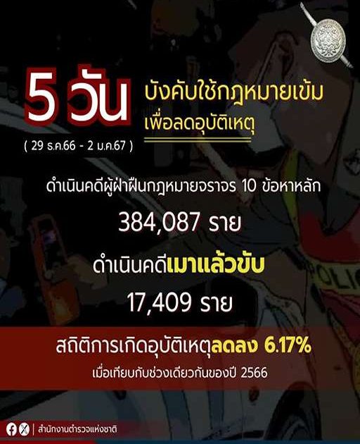 จากสถิติตั้งแต่ 29 ธันวาคม 2566 – 2 มกราคม 2567 ตำรวจดำเนินคดีผู้ฝ่าฝืนกฎหมาจราจร 10 ข้อหลัก เช่นขับรถเร็ว ฝ่าสัญญาณไฟ ขับย้อนศร ฯลฯ 384,087