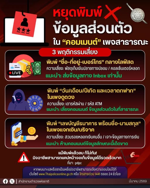 หยุดทำ 3 พฤติกรรมเสี่ยงเป็นเหยื่อมิจฉาชีพ หยุดพิมพ์ข้อมูลส่วนตัว ในคอมเมนต์เพจสาธารณะ พิมพ์ชื่อ-ที่