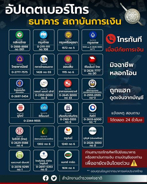 อัปเดตล่าสุด รวมเบอร์โทร “ธนาคาร – สถาบันการเงิน” สำหรับโทรด่วน “อายัดเงินใน
