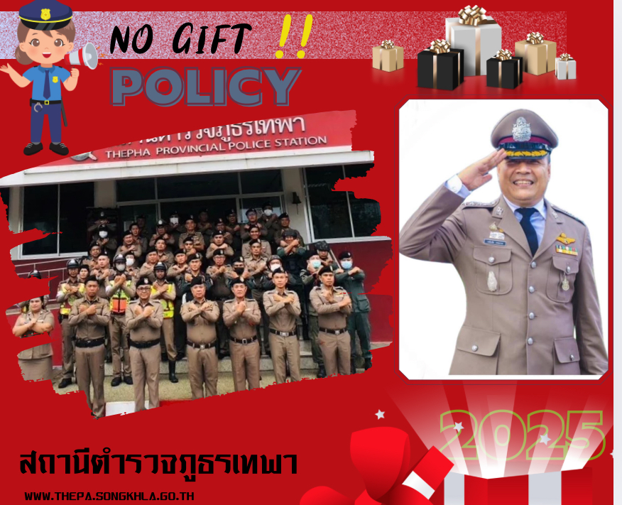 อินโฟกราฟิกนโยบายไม่รับของขวัญและของกำนัลทุกชนิด (No Gift Policy) จากการปฏิบัติหน้าที่ แสดงไว้หน้าแรกของเว็บไซต์หลัก >