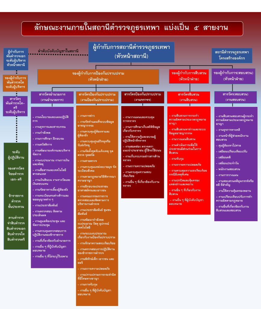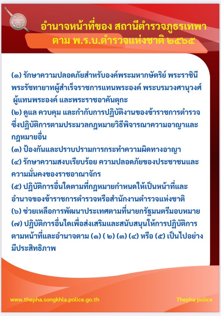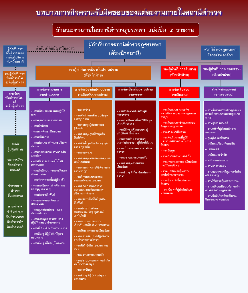 สถานีตำรวจ มีหน้าที่ตามประมวลกฎหมายวิธีพิจารณาความอาญา และตามกฎหมายอื่นอันเกี่ยวกับความผิดในคดีอาญาภายในเขตอำนาจการรับผิดชอบหรือเขตพื้นที่การปกครอง รวมถึงการรับผิดชอบในด้านการงานและการปกครองบังคับบัญชาถัดรองลงไปจากกองบังคับการตำรวจนครบาล (1-9) / ตำรวจภูธรภาค (1-9) หรือตำรวจภูธรจังหวัด เพื่อรักษาความปลอดภัยในชีวิตและทรัพย์สิน ความมั่นคงภายใน บริการทางสังคม ชุมชน และมวลชนสัมพันธ์ การพัฒนางานบริหารและงานจเรตำรวจ การป้องกันปราบปรามอาชญากรรมและการรักษาความสงบเรียบร้อย รวมถึงงานกิจการพิเศษ และงานอื่น ๆ ที่เกี่ยวข้องกับสถานีตำรวจ ซึ่งงานในสถานีตำรวจ แบ่งออกเป็น 5 สายงาน ตามคำสั่ง ตร. ที่ 537/2555 ดังนี้